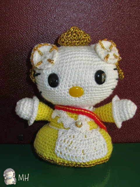 -La falda la alargué hasta prácticamente los pies, y la última vuelta la hice con hilo dorado para hacer collares y pulseras de los chinos (desde luego no se quejarán de la propaganda que les hago), que, como es bastante rígido, hace que la falda quede con vuelo y que la Kitty se sostenga en pie.