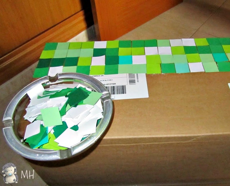 En realidad, consiste en cuatro cajas de cartón forradas de cuadraditos de cartulina de 3 x 3 cm. Las cartulinas son en tonos distintos de verde y en blanco.
