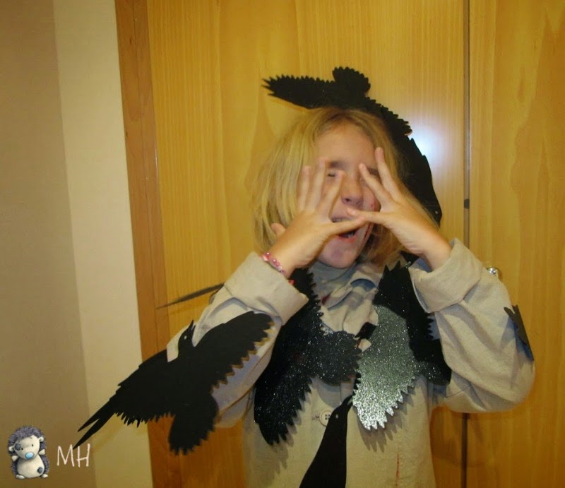 Sólo hay que coger una chaqueta en color claro, pegarle unos cuantos pájaros cortados en cartulina (yo compré unos cuervos de cartulina que vendían para Halloween) y fabricar una diadema con 2 o 3 pájaros más.