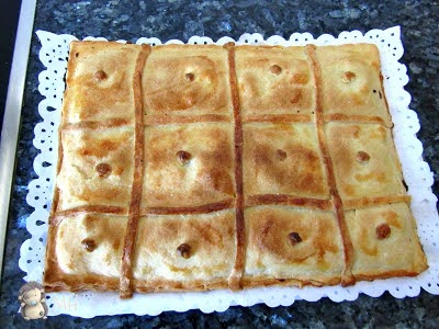 Lo pintamos con clara de huevo para que quede dorado y brillante y lo metemos al horno, a 170 grados hasta que quede dorado. La masa se tiende a hinchar, por lo que con un palillo le hacemos unos agujeritos que no se vean mucho (aprovechando los adornos).