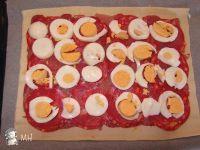 INGREDIENTES: dos masas de empanada (yo utilizo La Cocinera, porque no encuentro de otra marca, y además está buenísima), lomo adobado, chorizo en lonchas y huevos.