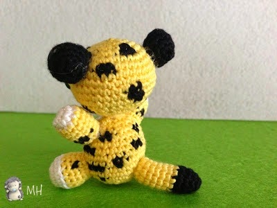 Empezamos con un anillo mágico y tejemos en espiral. Se hace en color amarillo intercalando algunos puntos en negro de forma que queden irregulares (es decir, 1 pb en negro, después en otro sitio 2 pb, etc, para que las manchas sean distintas).