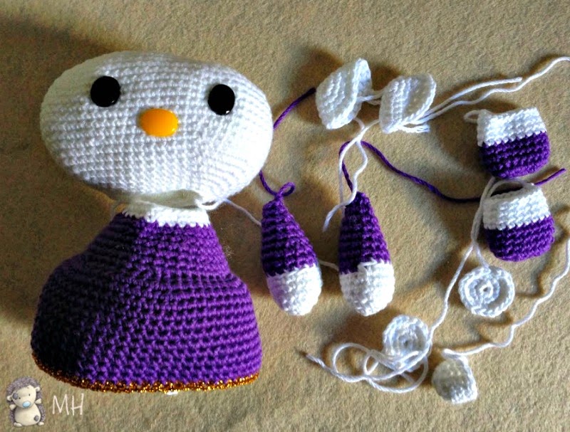 Cerramos con un hilo deslizado dejando una hebra larga para coser al cuerpo. Cosemos una lentejuela morada al zapato como adorno.