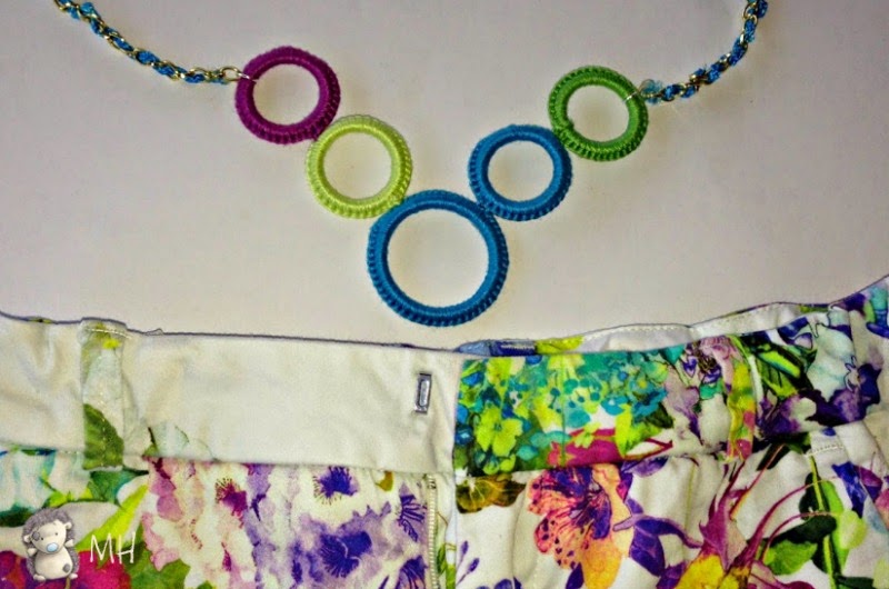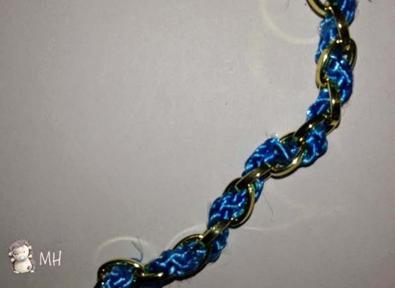 El collar está completado con la cadena a la que he ido entrelazando el hilo trenzado del mismo color que los aros azules.