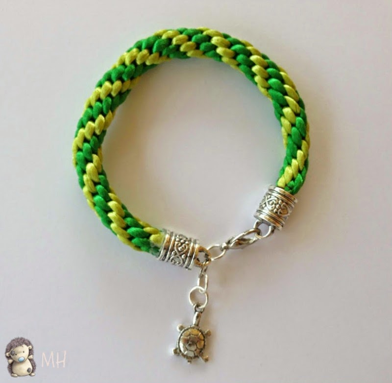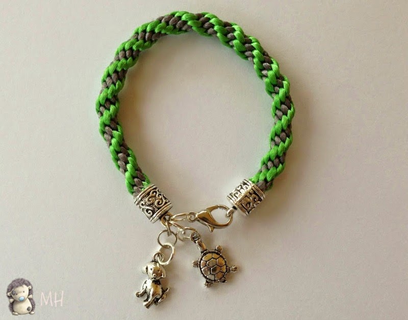 Esta pulsera (que es la del vídeo que he grabado) queda estupenda porque al ser uno de los dos hilos más grueso y con más textura que el otro tiene un aspecto en relieve estupendo. Como es para mi hija lleva además de la tortuga un perrito (estos charms o colgantes son de los chinos, como no, y en un paquete a 0.60 euros vienen un montón).