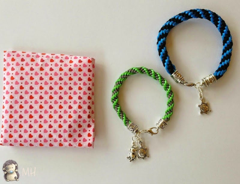 Con una cadenita he puesto un colgante de una tortuga a cada pulsera, y un mosquetón como cierre de la pulsera.