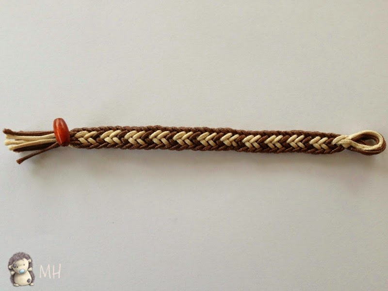 Está hecha con el plato cuadrado de Kumihimo (si no lo encontráis en vuestra zona podéis comprarlo aquí). Es el mismo patrón que en la pulsera de corazones, pero cambiando la forma de poner los hilos al inicio.
