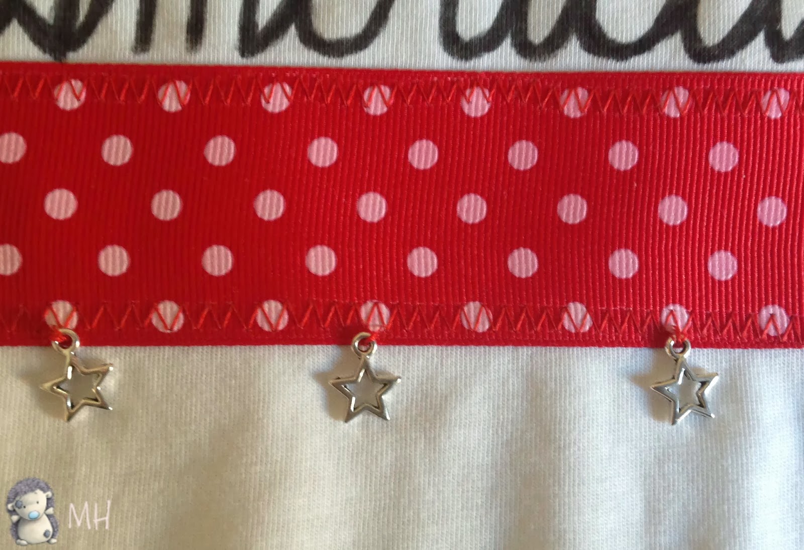 Lo primero es cortar y coser las tiras rojas a lunares. Las cortamos un poco más cortas que el ancho de la camiseta, las pegamos con la cinta para dobladillos (o cualquier entretela adhesiva de doble cara) y las cosemos a la camiseta con un zigzag.
