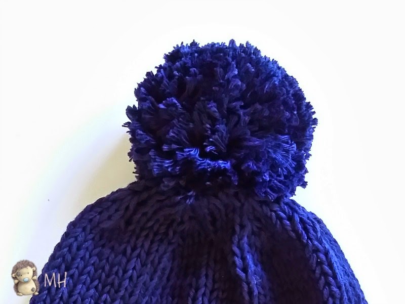 Una vez finalizado, cosemos los laterales punto a punto, cerramos la parte superior pasando el hilo por todos los puntos y colocamos un pompón grande hecho con la misma lana.